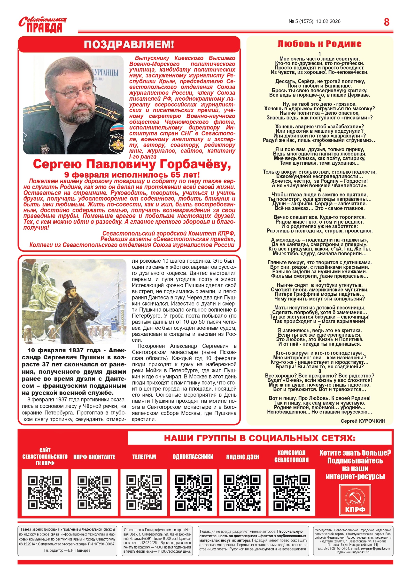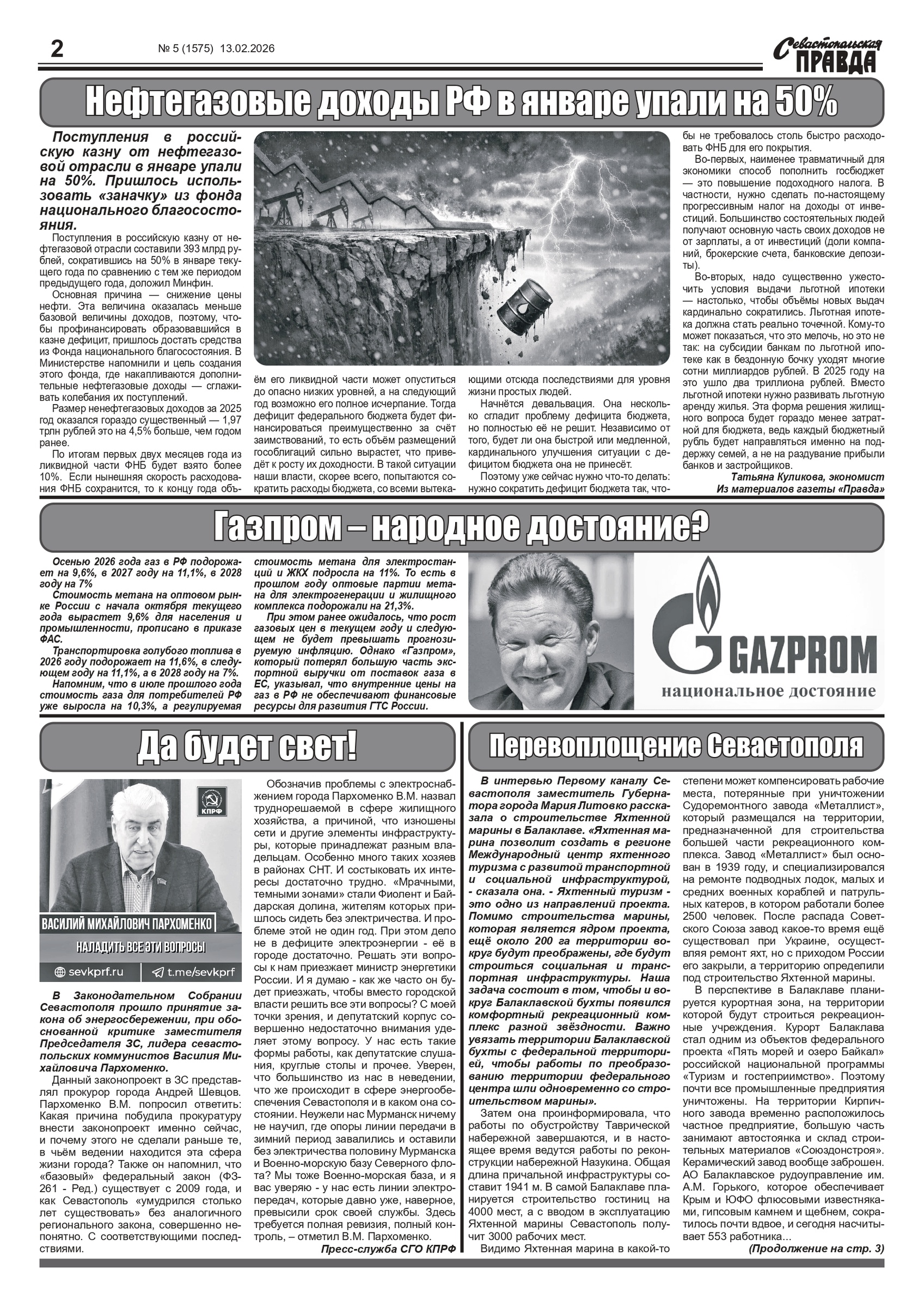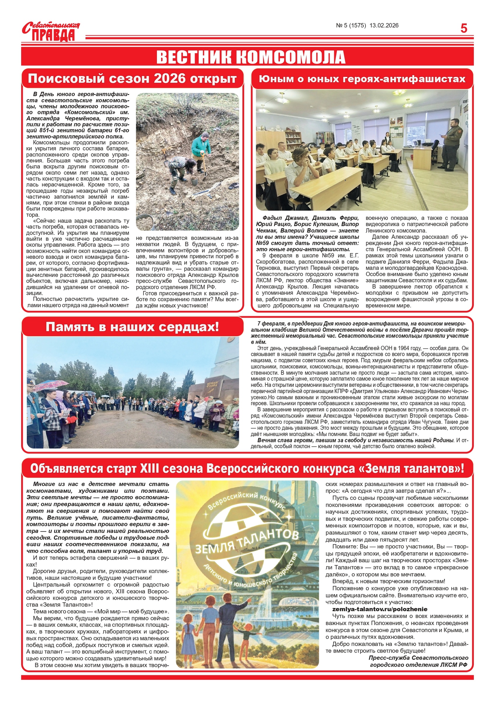 Газета “Севастопольская правда” № 5 от 13 февраля 2026 г., доступна в электронном виде